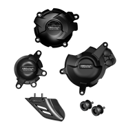 Race developed crash protection set includes FIM-approved secondary engine case cover set (consists of alternator / generator / stator cover, clutch / gearbox cover and pulse / timing cover), lower chain guard / shark fin and 8mm paddock stand / swingarm crash bobbins.