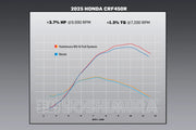 The newest CRF450R boasts a new chassis, airbox and ECU configuration. Our engineering and development team has had their nose to the grindstone with Team Honda HRC to squeeze every drop of performance out of the new 450. With our new RS-12 Signature Series titanium full system, we achieved a max HP gain of 3.7% over stock while the max torque gain came in at 1.3%.