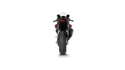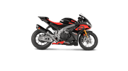 The combination of race-proven, lightweight materials, exceptional production quality, perfect design, amazing sound, and top performance makes this exhaust a must-have for discerning riders that demand the best. It is constructed with a carbon-fibre muffler outer sleeve and end cap, with a fully titanium link pipe and inner muffler structure, matched to high-grade titanium alloy for the headers and collectors, resulting in a full system that is 44% lighter than stock. Developed for use on closed-course competition circuits, this racing track–oriented system requires mandatory remapping and removal of the passenger footrest. It delivers increases of power and torque of 4.0 kW (5.4 hp) at 13,000 rpm and 3.8 Nm at 7,700 rpm when measured in back-to-back comparisons against an Aprilia RSV4 with a standard stock system on the in-house dyno. This race-developed system delivers a distinctive deep, sporty sound, perfectly endorsing the Akrapovič character.