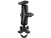 This product, when connected to a RAM Mount cradle or holder, will allow you to mount your electronic device to your motorcycle handlebars, or any other bar that is between 0.5" and 1" (1.27cm to 2.54cm) in diameter. It includes a stainless steel u-bolt base, a double socket arm, and a diamond base adaptor.